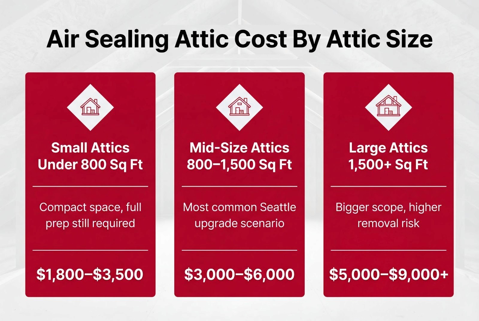 For a typical Seattle home, air sealing attic cost as a stand-alone line item usually falls between $500 to $1,200 for small to mid-size attics.