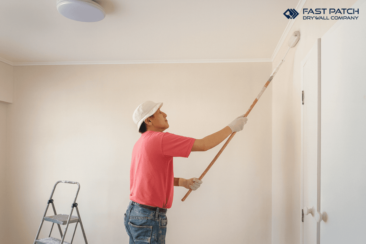 You can roll a small, low ceiling yourself if you are comfortable on a ladder and you have time to prep properly. Expect to buy rollers, a quality brush for edges, tape, plastic, drop cloths, and possibly a stain-blocking primer.