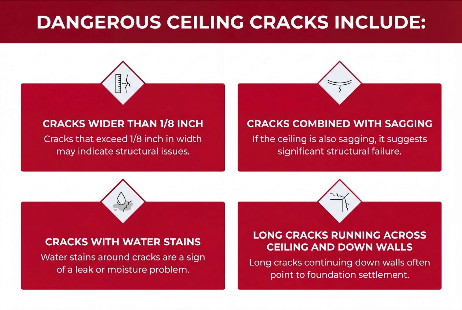 Ceiling cracks plus sagging or stains require urgent evaluation.