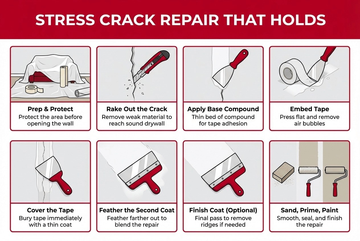 A common DIY “repair” is smearing mud over a hairline and painting. It looks good for a minute. Then the line prints back through because you didn’t give the repair any mechanical key.