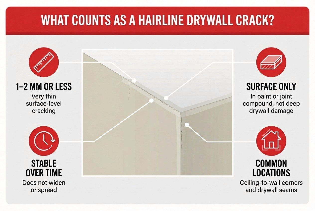 Hairline cracks in paint or joint compound, often around corners, seams, or where the wall meets the ceiling