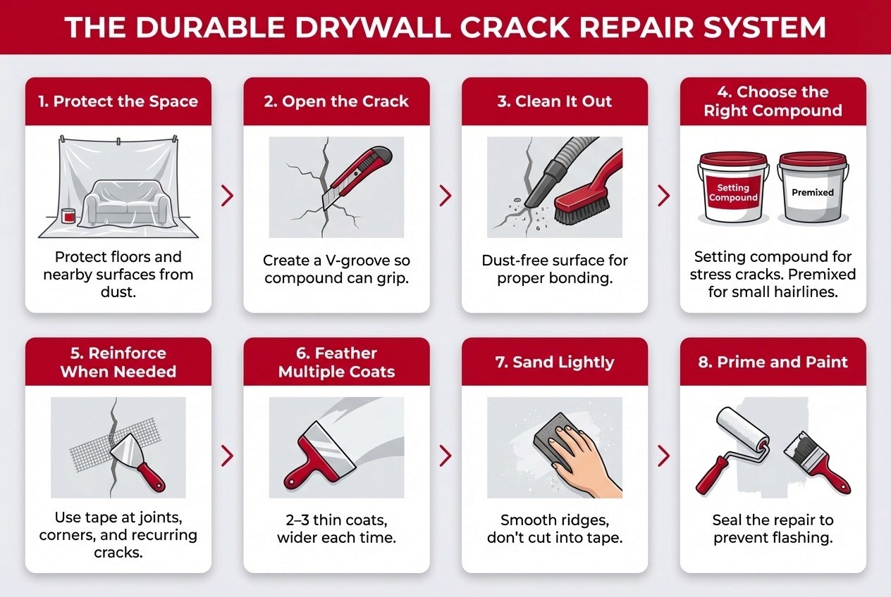 If you want the crack gone without turning your house into a dusty project, this is what we do differently: