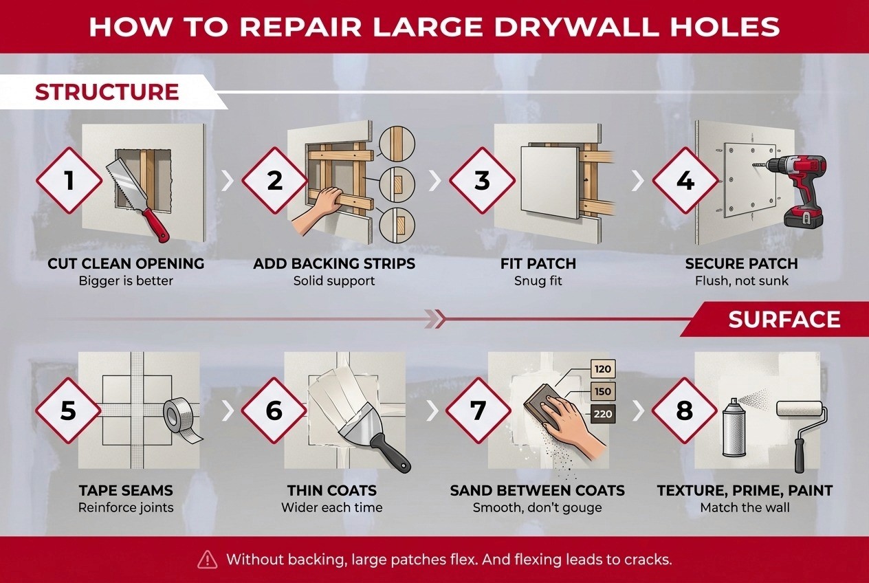 Backing strips and reinforcement prevent cracking on medium and large drywall repairs.