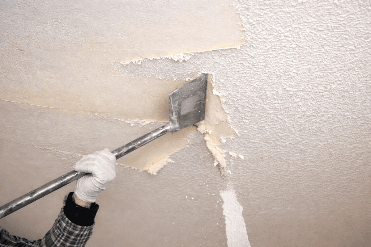 Wet Scrape. Mist a small section, wait 10–15 minutes, then scrape at a low angle. Easiest on unpainted ceilings.