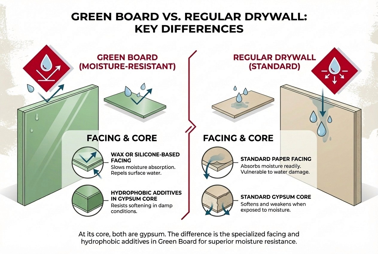 In dry, conditioned spaces, they perform identically. In humid rooms, standard drywall absorbs moisture faster, swells, softens, and becomes a mold risk much sooner.